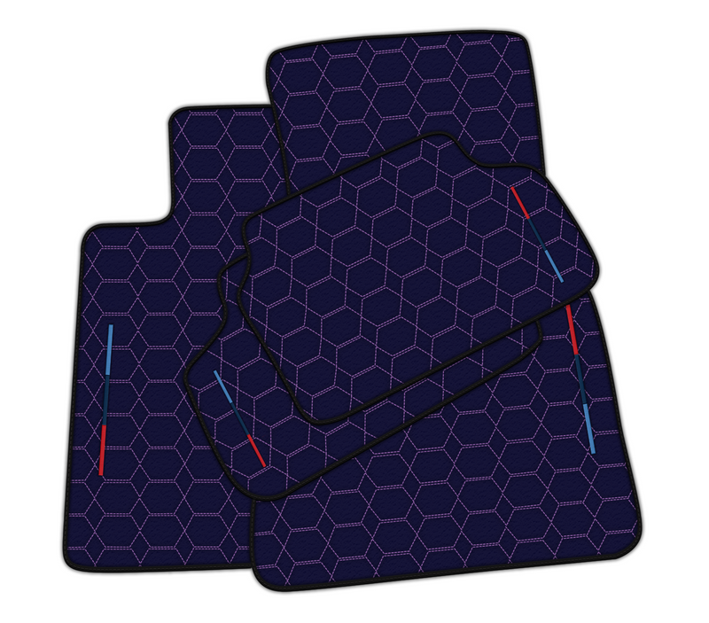Verschönern Sie Ihren BMW mit unseren dunkelblauen Lederfußmatten. Mit stilvollem Hexagon-Muster, violetten Nähten und dem dreifarbigen M verleihen diese Matten Ihrem Innenraum einen Hauch von Eleganz. Sie schützen vor Abnutzung und verleihen ihm gleichzeitig einen luxuriösen Touch.