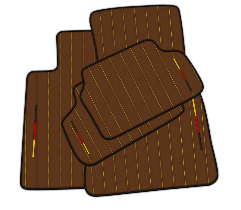 Werten Sie Ihren BMW-Innenraum mit unseren hochwertigen braunen Lederfußmatten auf. Diese Matten sind perfekt auf Ihr Fahrzeug zugeschnitten und bestechen durch ihr elegantes Linienmuster, gelbe Nähte und die ikonische deutsche Flagge. Holen Sie sich die perfekte Kombination aus Stil und Schutz für Ihr Auto.