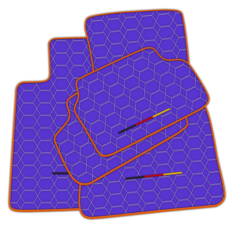 Upgrade your car's interior with our Purple Leather Floor Mats for BMW. Made from high-quality leather, these mats feature a stylish hexagon pattern with white stitching and eye-catching orange trim. Show off your German pride with the included German flag. Elevate your driving experience today.