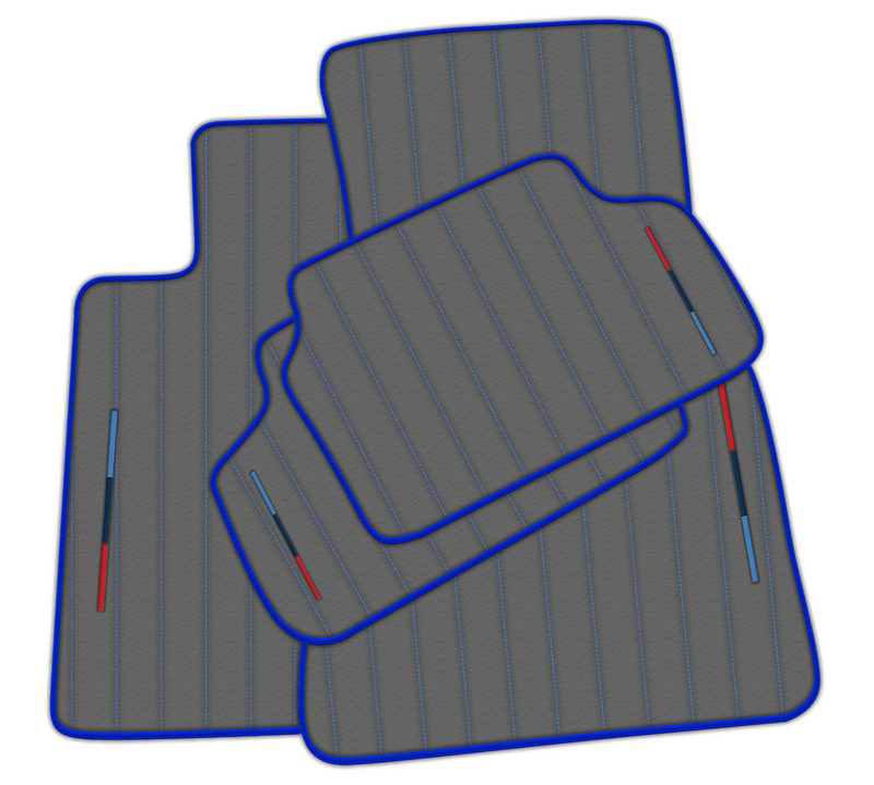 Aggiorna la tua BMW con questi tappetini per auto in pelle grigia di alta qualità. Non solo offrono un aspetto elegante e stiloso con il loro motivo a righe e le cuciture blu, ma presentano anche l'iconico tricolore M per un tocco di sofisticazione in più. Perfetti per proteggere i pavimenti del tuo veicolo mentre ne elevano l'aspetto.