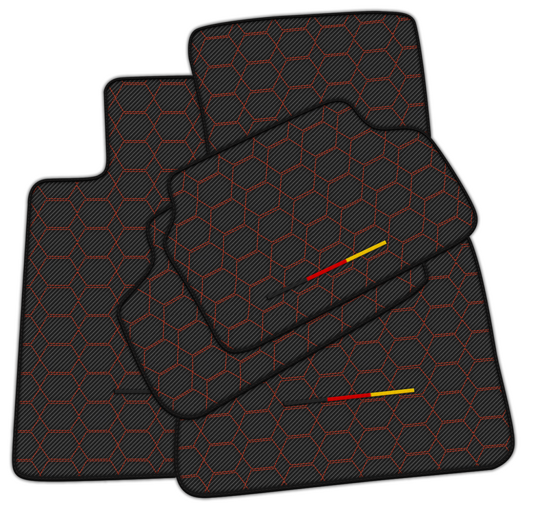 Eleva tu BMW con nuestras alfombrillas de fibra de carbono. Con un elegante patrón hexagonal, costuras rojas y la bandera alemana, estas alfombrillas combinan estilo y funcionalidad. Hechas de material de fibra de carbono de alta calidad, ofrecen una durabilidad y protección superiores para el suelo de tu coche.